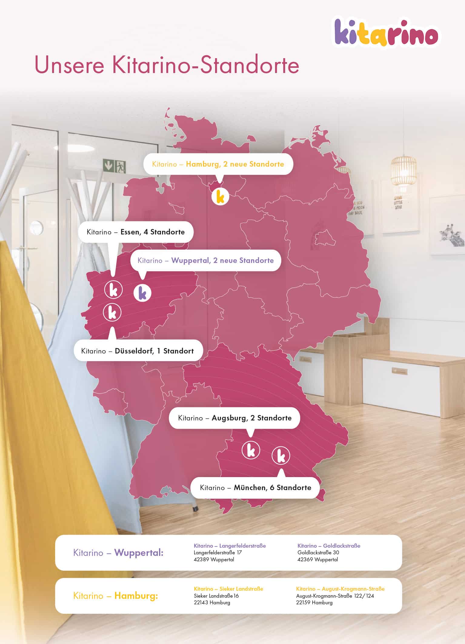 Die neuen Kitas in Hamburg und Wuppertal sind eine wertvolle Ergänzung zu den bereits bestehenden Kitarino-Standorten in München, Augsburg, Essen und Düsseldorf. Mit dem klaren Ziel, bis 2034 rund 17.000 Betreuungsplätze für Kinder im Alter von null bis sechs Jahren zu schaffen, plant Kitarino insgesamt etwa 170 Standorte in den Bundesländern Nordrhein-Westfalen, Bayern, Baden-Württemberg und Hamburg. „Unsere Mission ist es, jedem Kind eine glückliche Kindheit zu ermöglichen. Dafür schaffen wir Wohlfühlorte, die Kinder inspirieren, Eltern entlasten und Mitarbeiter:innen wertschätzen,“ erklärt Patrick Smague.